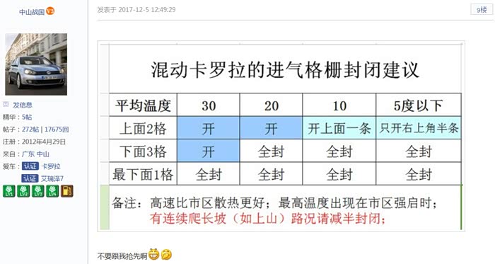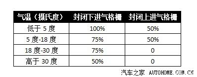 以及 Carzone版主提供的Priuschat成员Ken总结封闭进气格栅程度与气温关系建议: