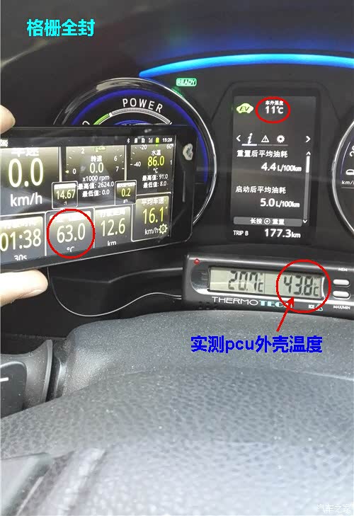 传两幅图,外界气温分别为5度和11度,格栅全封的数据。注意在停车后拍的,进气温度和pcu温度都会比行进时上升不少。