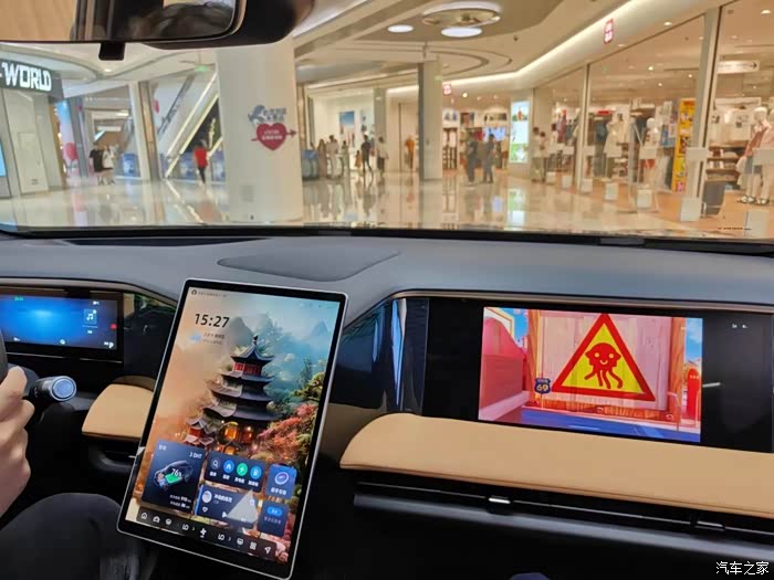 内饰的布局用料是相当的漂亮的,看着很上档次,做工那是相当的漂亮,严丝合缝的,还有主副驾驶各一块大屏幕,也很流畅,听说用的是8155芯片,反应很快,而且副驾驶屏幕功能也很多,可以独立操控,可以看电影玩游戏还可以刷抖音,这个还是很不错的,副驾长途驾驶也不会无聊,就不知道开起来用着会不会头晕,我乘车要是看手机就会。还有一个就是车子没有实体按键,都是触屏的,这个就很考验车机的灵敏度和流畅度了。