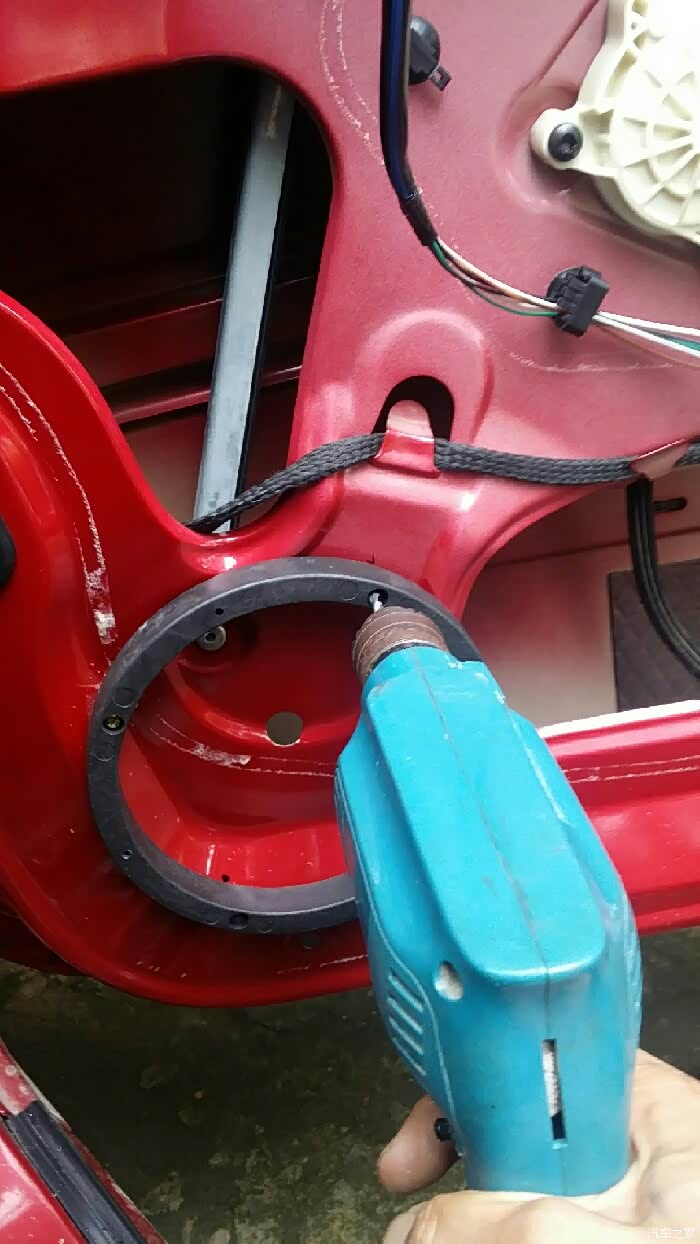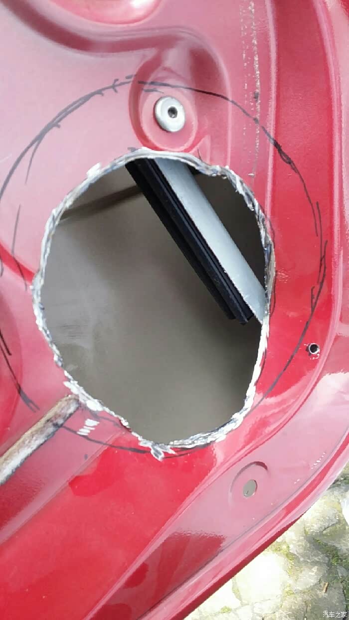 我用的是左边的切割片打的孔,先确定好孔的中心位置,然后用记号笔画一个大致的圆形。不要太大,反正要用三个垫圈垫高,然后就可以切了,