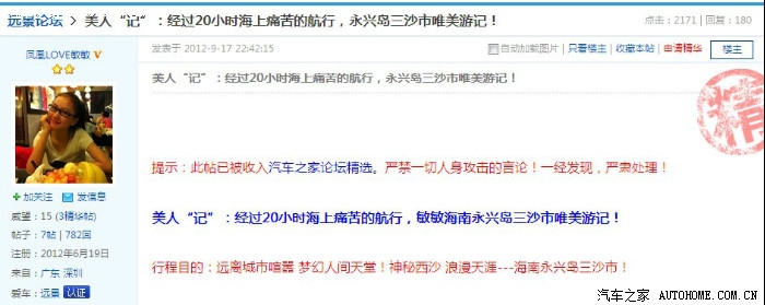 敏敏没想到在远景论坛里面得到各位车友们的支持、厚爱,在背后一直默默支持着敏敏,敏敏内心真的感激不尽,在发帖美人“记”:经过20小时海上痛苦的航行,永兴岛三沙市唯美游记!