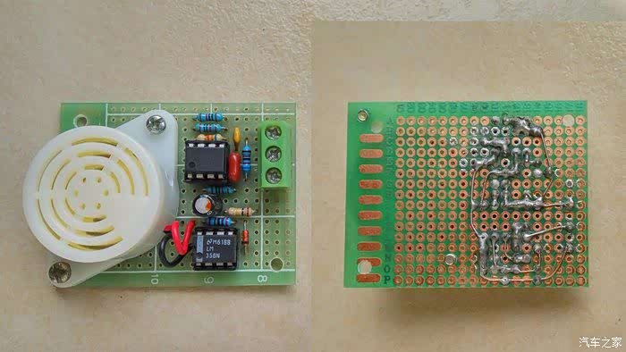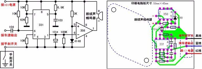 停车时拉起手刹,手刹开关内部的常闭触点接地,即电源回路接通。当点火开关扭到ON档,手刹未松行车提醒电路得电工作。由于输入的车速输出方波频率为零,集成电路331转换后的电压幅度也为零,比较器358输入端6脚电压低于5脚,输出端7脚为高电平,蜂鸣器不工作。当车辆启动后车速低于7公里时,车速输出的方波频率经331转换后的电压幅度较低,使358输入端6脚电压仍然低于5脚,故蜂鸣器还是不工作。当车速达到或超过7公里时,车速输出的方波频率经331转换后的电压幅度升高,导致358输入端6脚电压高于5脚二极管4148的电压降,故输出端7脚就跳变成低电平,蜂鸣器负端经7脚接地工作,嘀…嘀…提醒声响起,提醒驾驶员赶紧放松手刹。手刹放松后,手柄下压手刹开关使其内部的常闭触点断开,电源回路被切断,蜂鸣器停止工作,嘀…嘀…提醒声立即停止。
