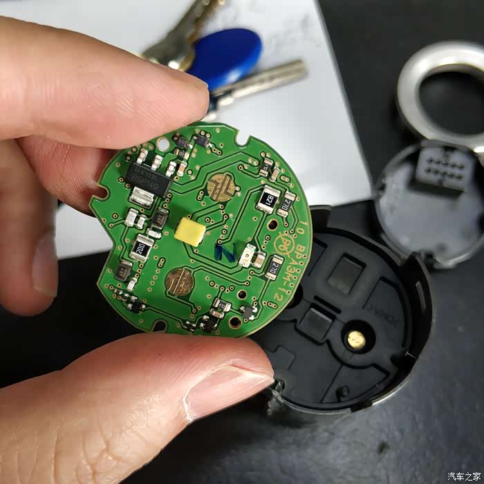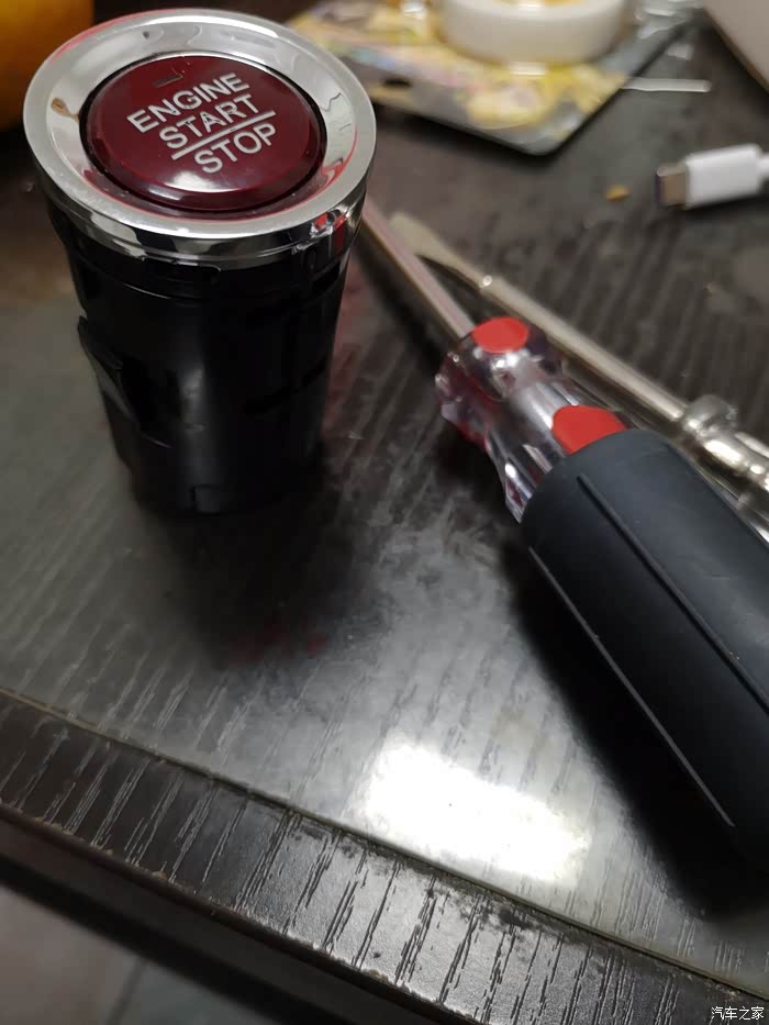 7、开关尾部拆开,这个比较简单,拿手上看看就懂了。用棉签沾酒精擦拭硅胶垫和电路板上的金属触点,擦掉表面黑色的氧化物或者是脏物,再组装回去。拿到车里,首先把USB面板背面的钥匙感应天线接上,然后把启动开关的线插好,启动车子,看看故障灯是否不再亮起。确定故障排除后,熄火,所有部件安装归位,维修结束。