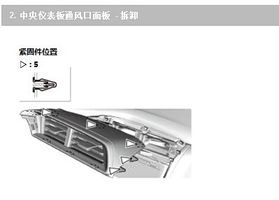 2、拆除仪表外框后,才可以拆中间出风口装饰板,然后拆掉中间出风口,三个卡扣在底部与屏幕结合处,请用塑料撬棒小心的撬开后拔出。