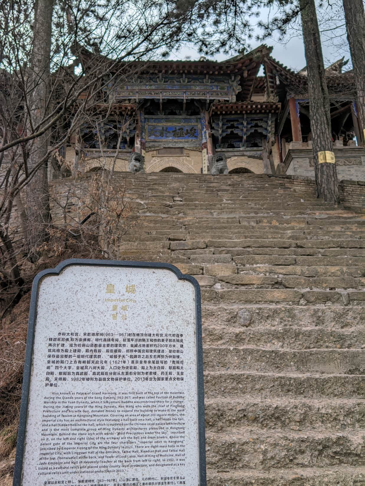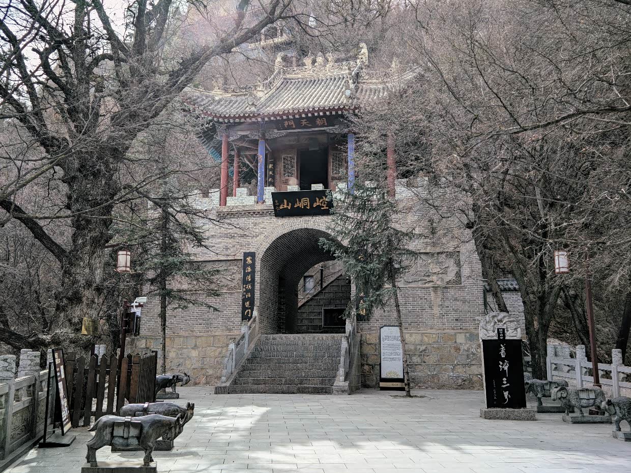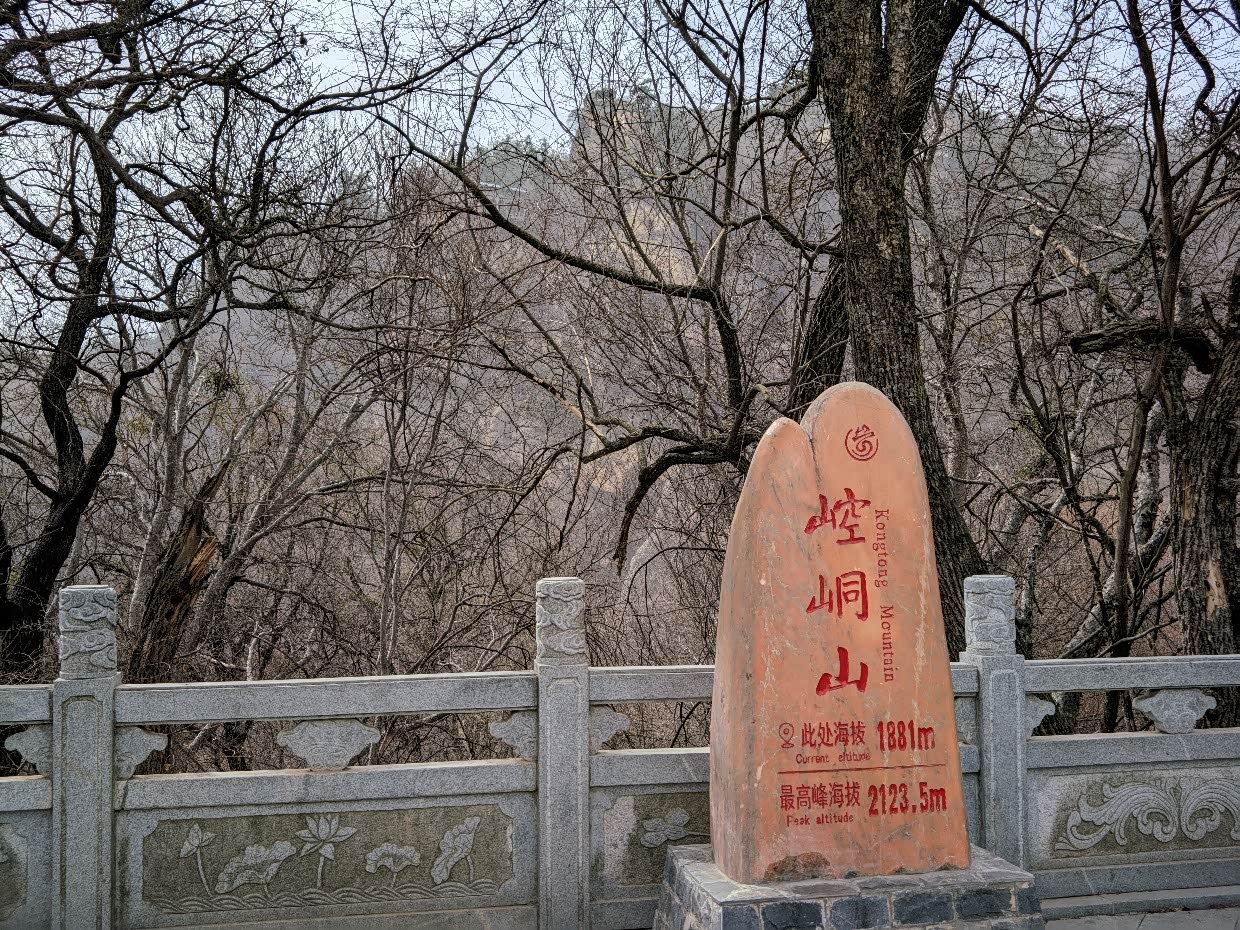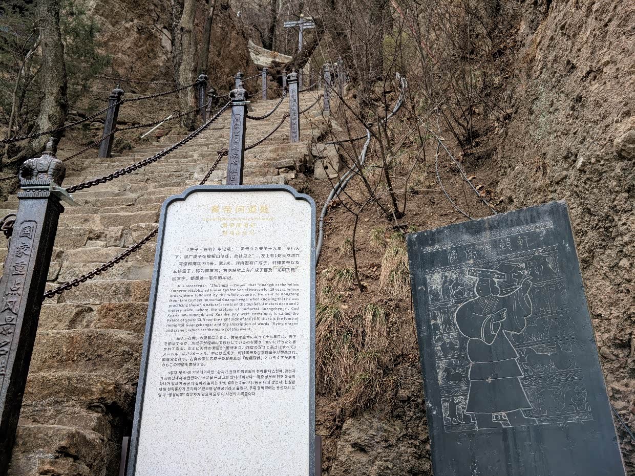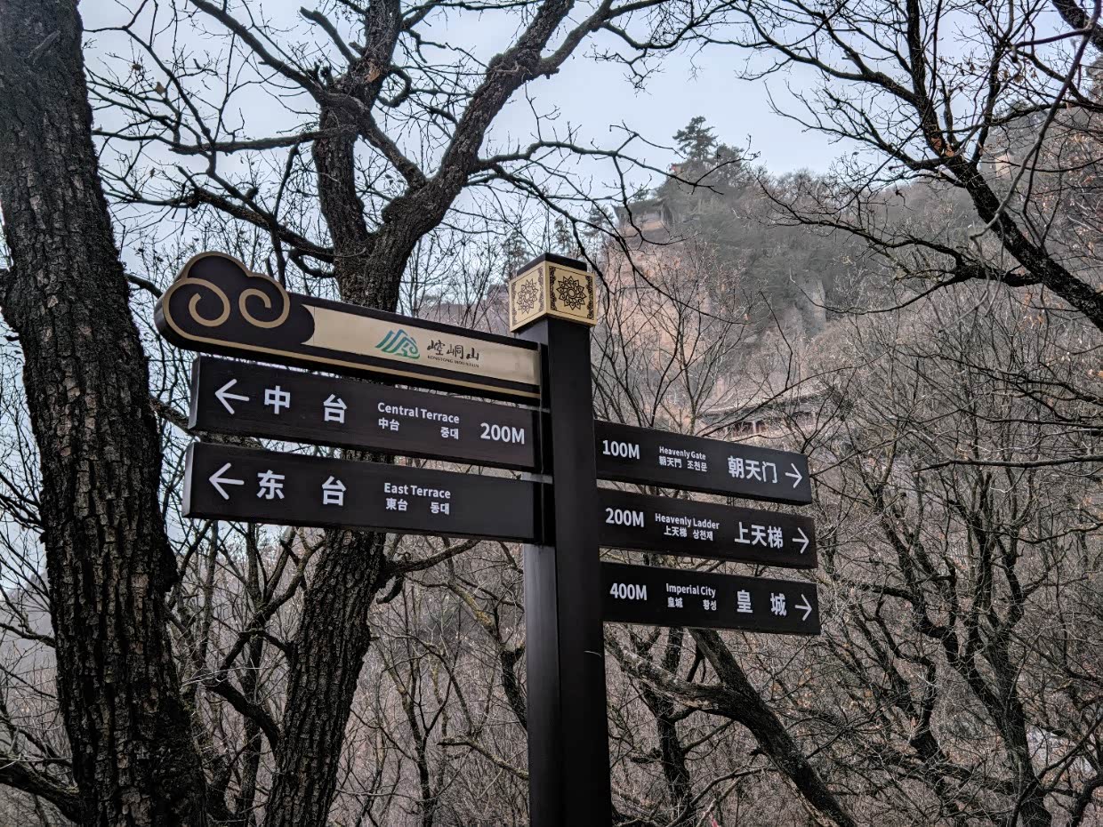14:40;从中台前往皇城,依次经过崆峒山石碑、西巡崆峒登临处石碑、朝天门、药王洞,到达上天梯。