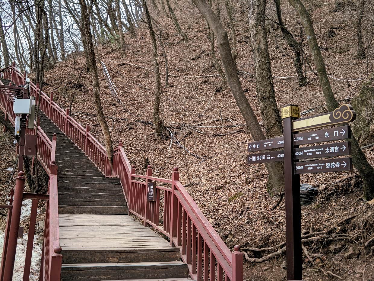 从进门开始是一段又长又陡的阶梯路,行进速度较慢。道路两边好多雀鸟,让寂静的景区增添一点生气。