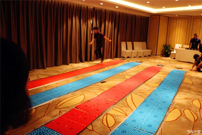 这个赛道是指压板铺成,选手须完成一幅汽车拼图,每次只能拿3张拼图,谁最快就算获胜