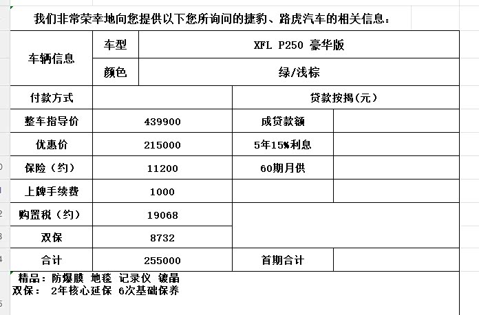 最开始去的是成都惠通路华捷豹路虎双流机场店,销售最初报价落地贷款26.5,了解完价格后发现价格还是有点偏高,我们就说去另一家店看看。然后我们就来到了合力创店,一进去销售就直接把上一个的报价单给我们看,24.5。突然就觉得便宜了两万,这家更有诚意,但是想这能便宜一点是一点。于是我们一直和销售迂回,但是销售始终不松口,并且想绕我们,我们也不是傻子,就叫他送3次保养,但是他说他们有区补,可以领4000块钱,如果领不到就送保养,可是我们要送保养加补贴。于是我们给之前的店打电话,他说叫我们过去肯定比他们的优惠多,于是我们过去销售说24.5送4次保养,最后经过我们软磨硬泡他还反了500上牌费最后就是24.5成交,这个价格是包含3年延保加10次保养,所以一共是14次保养。最后价格的话是裸车21.5万 购置税约1.9万,保险10500左右,上牌500,全部落地24.5万