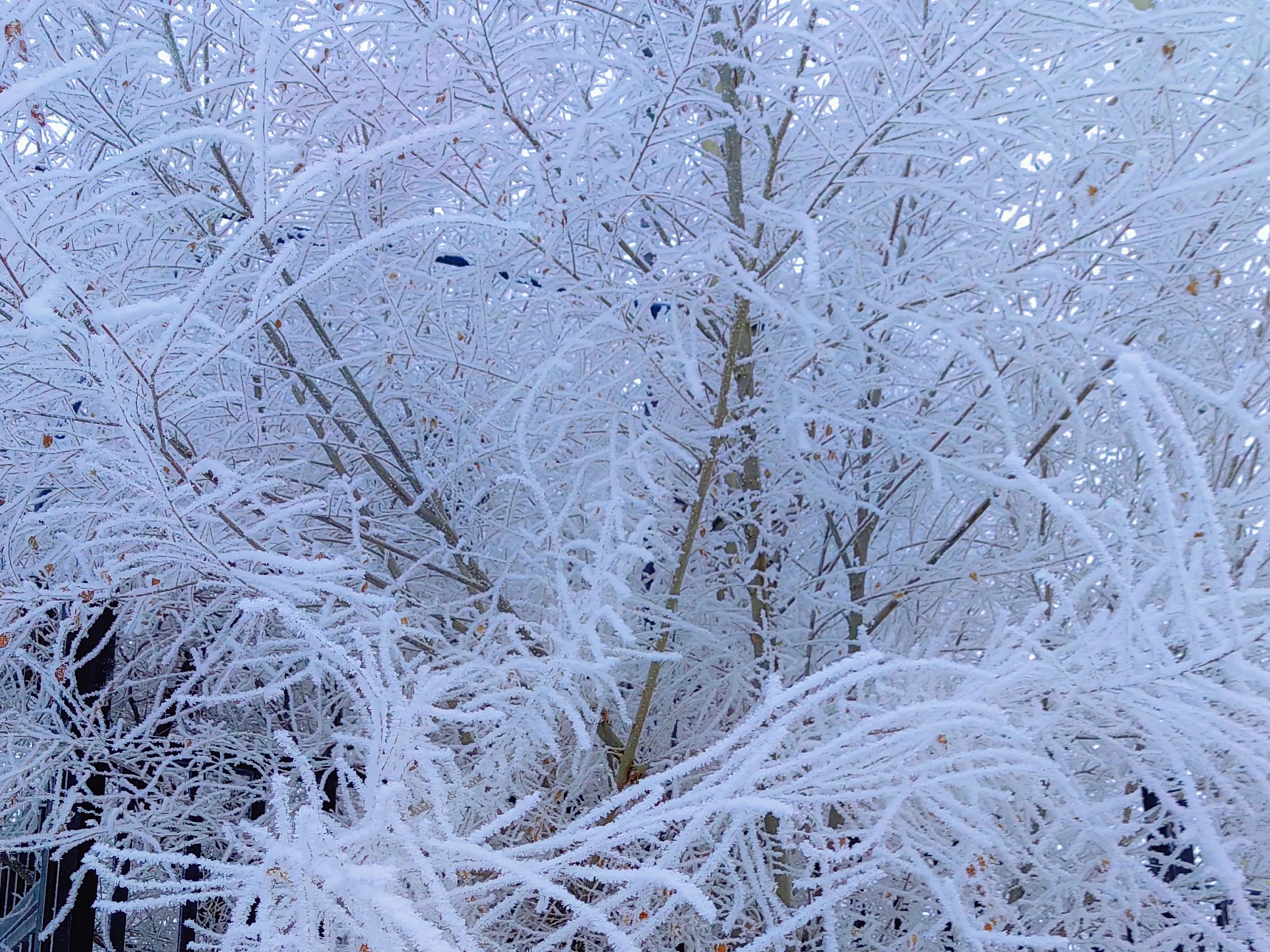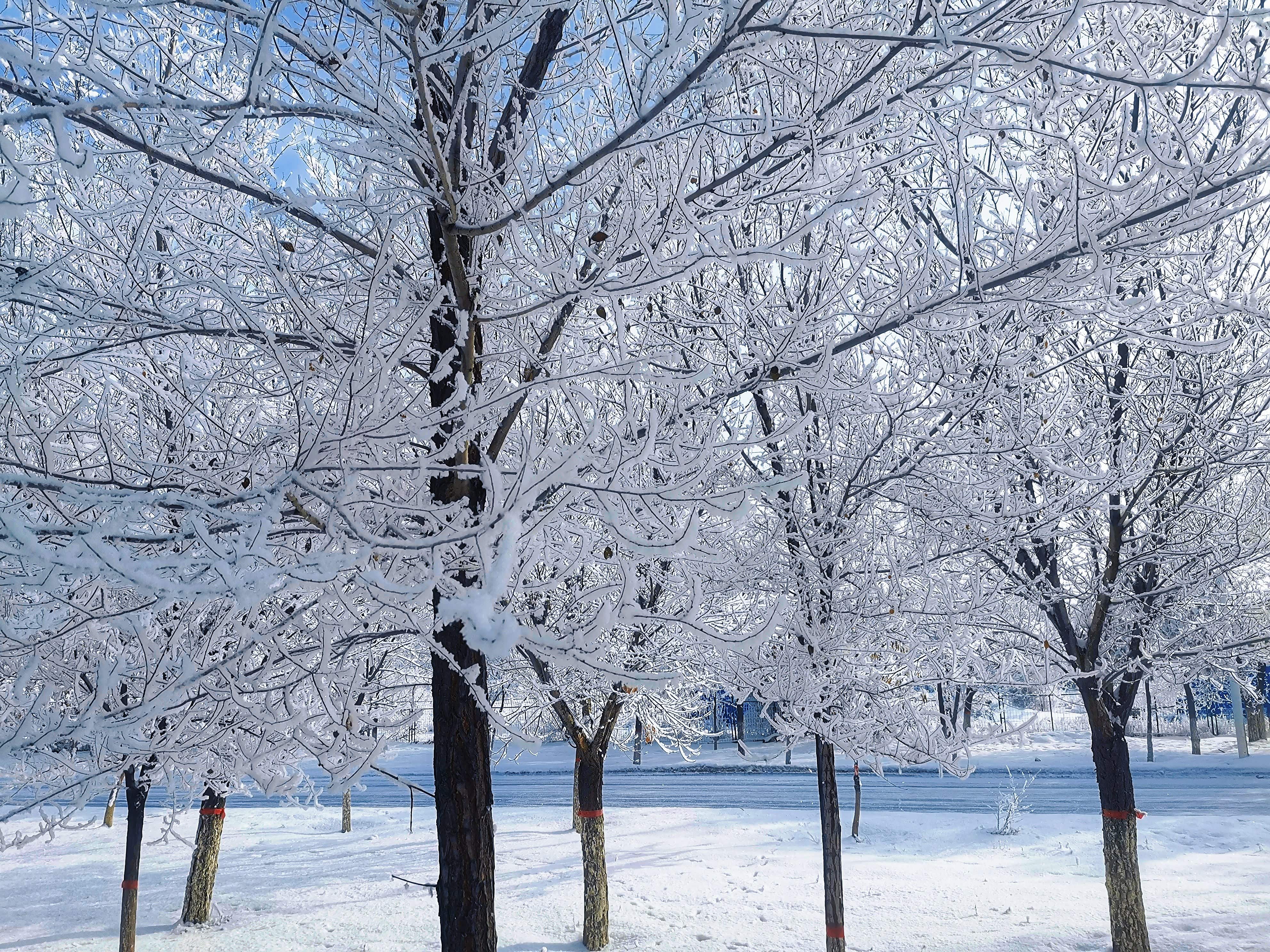 路边的树全换了模样,枝桠上裹着厚厚的雾凇,像缀满了晶莹的水晶,风一吹,簌簌落下细碎的冰晶。