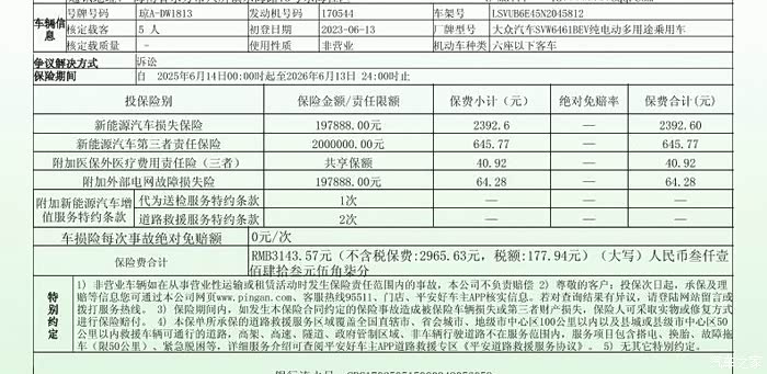之前听海南车友传言电车保险即将大幅上涨,为了避开涨价,我提前一个月就在4S店内续保了。选择店保主要是看中它附赠的每年2次基础保养,这能省下一笔开支。毕竟电车跟油车不一样,厂家建议一万公里保养一次,大概是出于安全考虑,毕竟车上拖着一块大电池。一次保养费用本来要480元,但我目前保养了6次,包括四轮定位和车内消毒等,全部都是保险附赠的免费项目。我觉得挺划算,店内续保价格跟外面区别不大,但外面基本没有赠送保养。