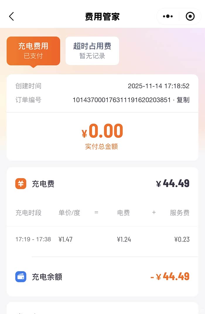这是单次商业充电桩的费用截图,我充值了500元的电卡,充电直接从里面扣除,充值有一定优惠。
