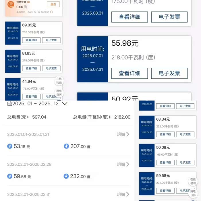 这一年,我大部分时间使用的是家用充电桩。海南谷电时段每度电0.26元,目前11月的账单还没出来,按照去年的用电情况,应该大差不差,平均下来每个月大概60元,一年约720元。