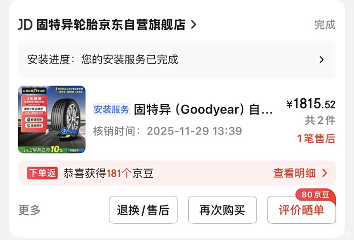 当时询问4S店,原厂韩泰轮胎一条要1800元,虽然“买三送一”,但这个报价还是让我觉得自己听错了。回家后我去某虎和某东比价,最终选择在某东购买固特异线下安装。两条优惠后1815元,折合每条907元。