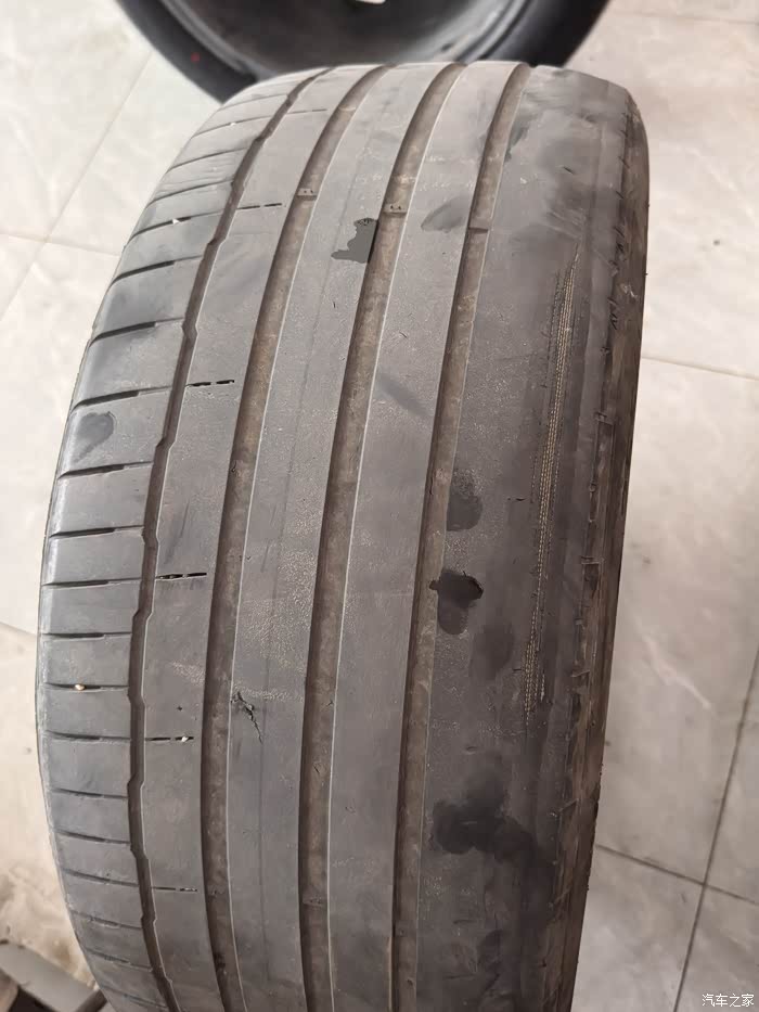 这个轮胎的钢丝线已经暴露出来了,必须更换,上次保养的文章里也提及。