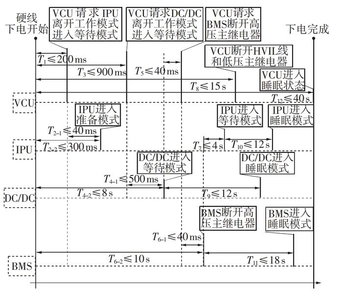 在低压下电过程中,当启动键切换到OFF档,首先进行将断开高压供电,车辆各ECU开始陆陆续续停发网络管理报文,然后停发应用报文,进入休眠下电流程,最后控制电源管理模块,断开供电。