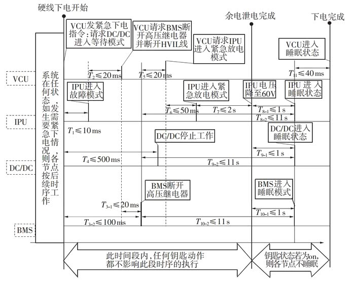 在正常上电状态下,如果出现绝缘阻值低于阈值、高压互锁断开、IGBT过流等严重故障时,VCU会进行紧急下高压电流程,首先VCU请求DC/DC脱离工作模式,DCU进入failure模式,随后VCU请求BMS断开高压继电器,并且断开HVIL回路,随后 VCU 请求 IPU 进入紧急放电模式, DCU在规定时间内完成余电泄放, 若钥匙为关闭状态,则各节点进入休眠流程,如图4所示。