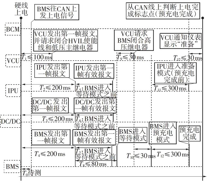 随后VCU请求BMS闭合主继电器,BMS则先后闭合主负继电器和预充继电器,当检测到母线电压达到阈值后,判断预充电成功,然后闭合主正继电器,并断开预充继电器,到这则高压上电完成,在VCU请求BMS闭合主继电器时,同时也会请求DCU、DC/DC进入工作模式,时序图如图2所示。