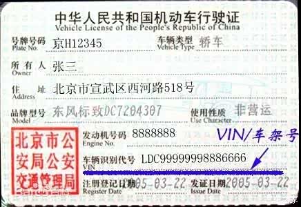 ⑶机动车行驶证上,发动机号下面车辆识别代码VIN;