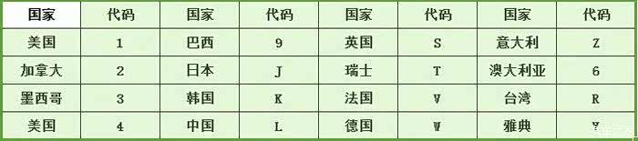 1和4-美国,2-加拿大,3-墨西哥,6-澳大利亚,9-巴西,J-日本,K-韩国,L-中国,R-台湾,S-英国,T-瑞士,V-法国,W-德国,Y-雅典,Z-意大利