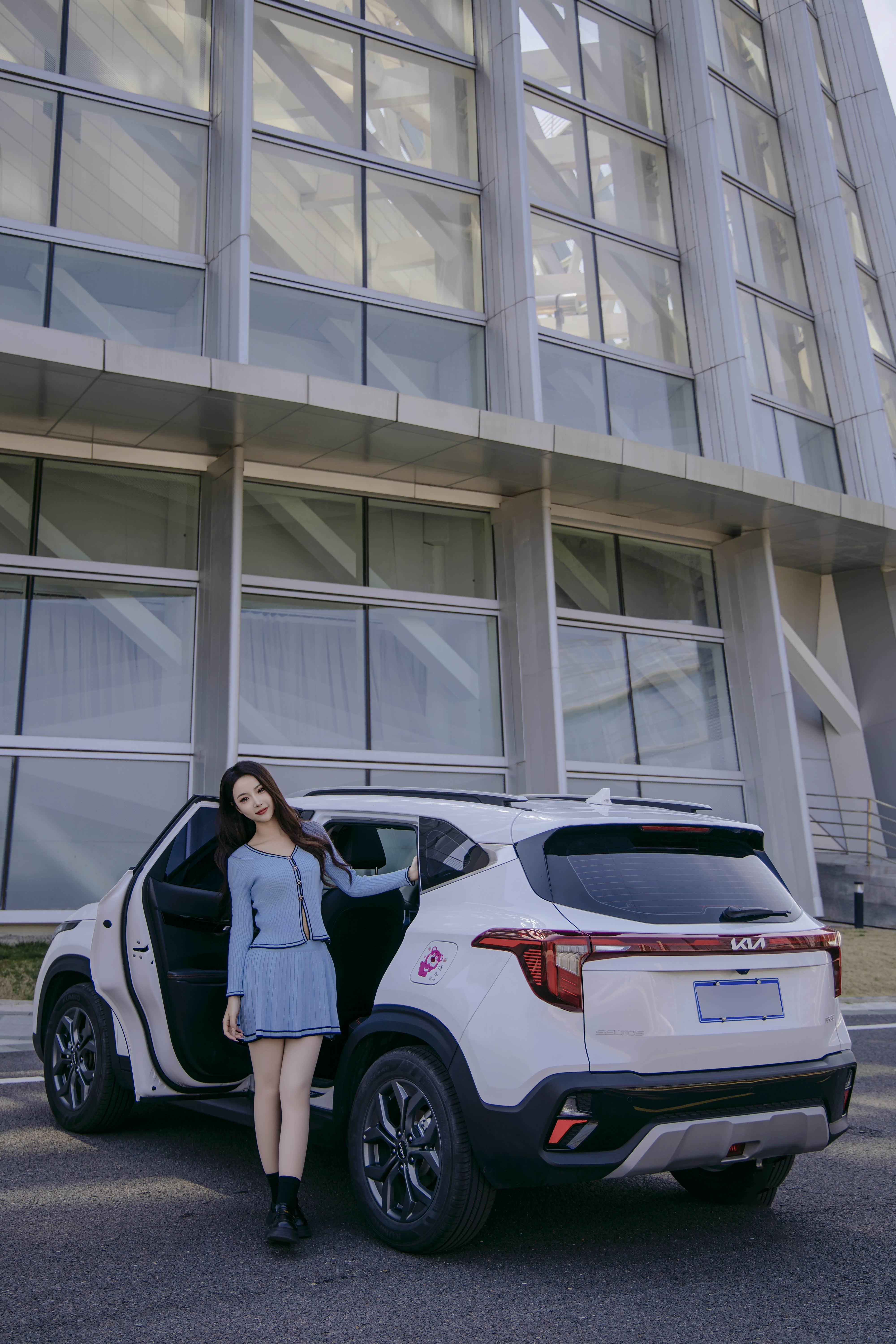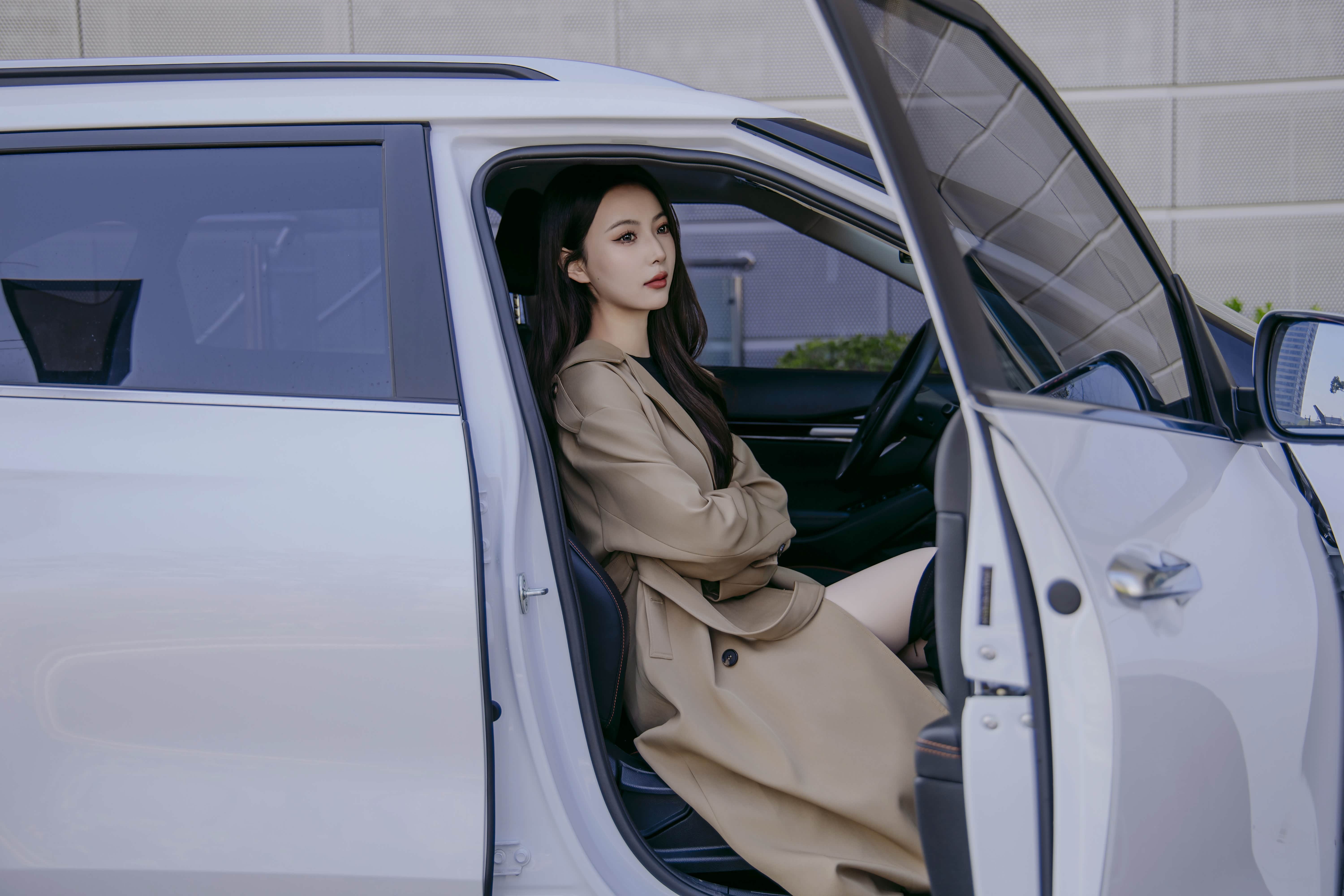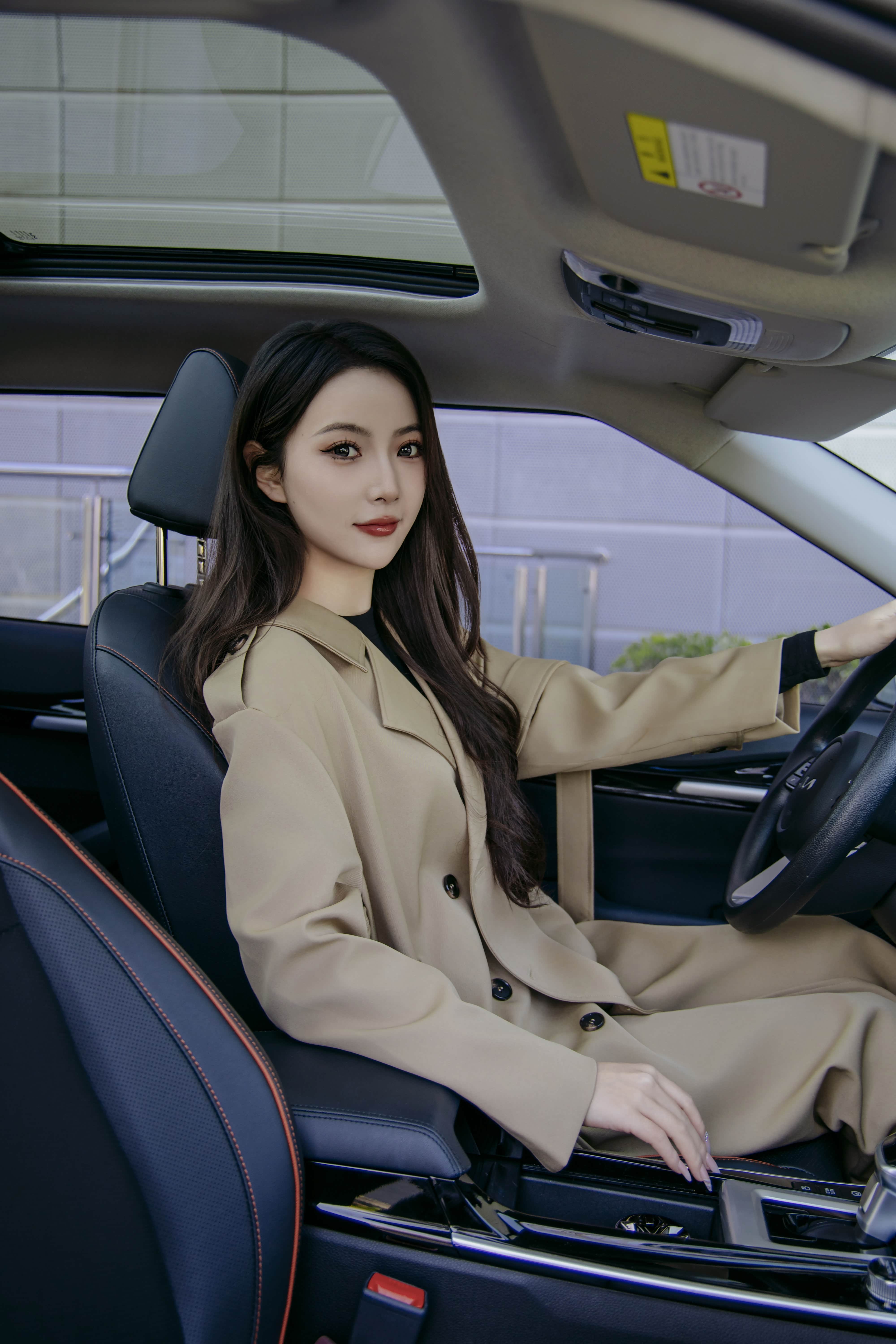 一身清新的闺蜜,坐在黑色内饰的车内,透着一种别样的风味。