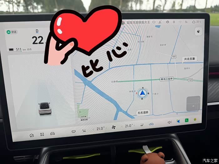 在一次上山的行程中,山路弯道多且复杂,但车机规划的路线非常精准,屏幕右侧还实时同步电量和附近充电桩位置,让我在驾驶过程中对车辆状态和行程规划心中有数。女朋友看到山脚下停车场的充电桩图标也显示在屏幕里,也感到很安心。