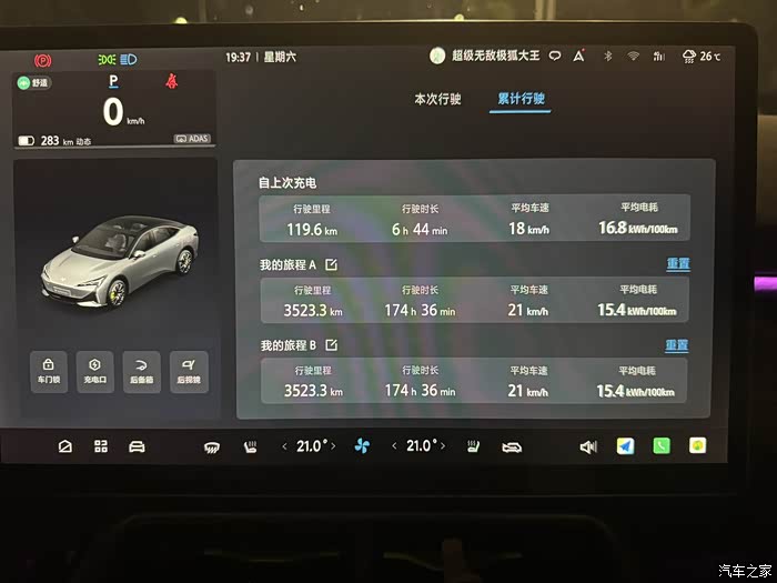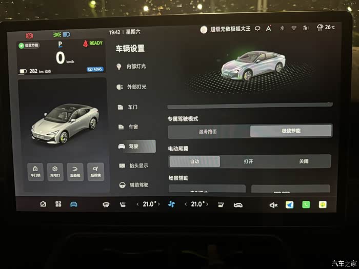 在能耗控制方面,极狐阿尔法 S5 的表现超出了我的预期。我主要在市区通勤使用,车辆搭载的是 245/45 R19 轮胎,车重近 2 吨,但平均能耗仅为 13.9kwh/100km 左右,这个数据在同级别车型中表现相当出色。