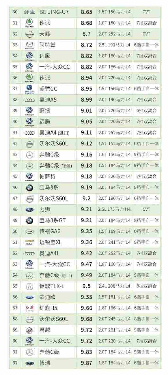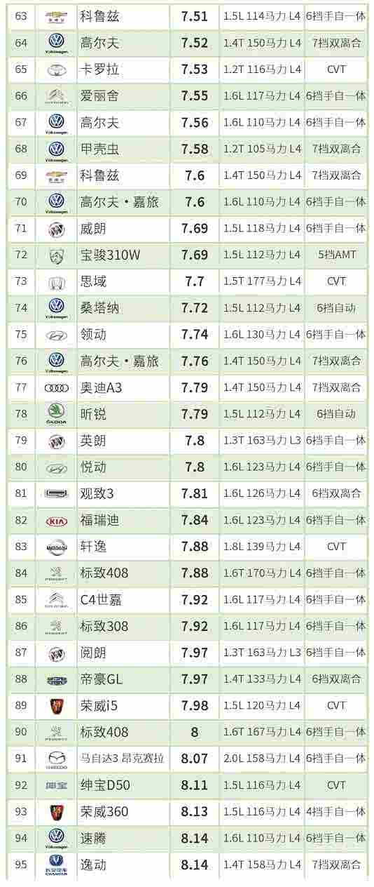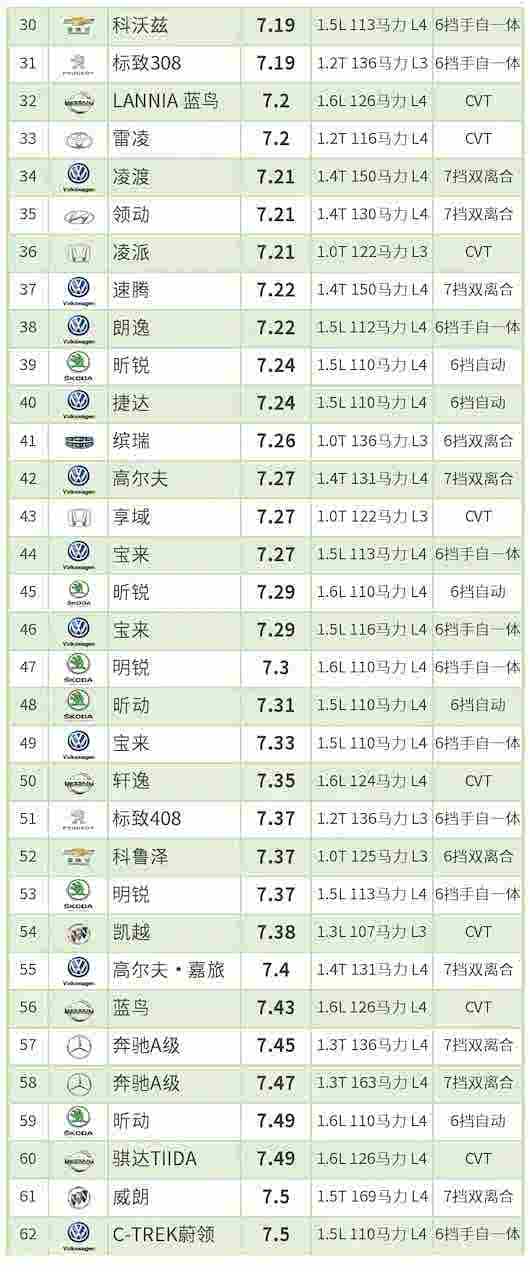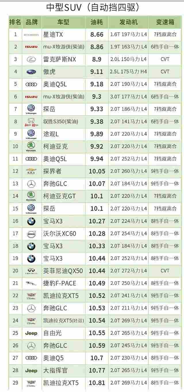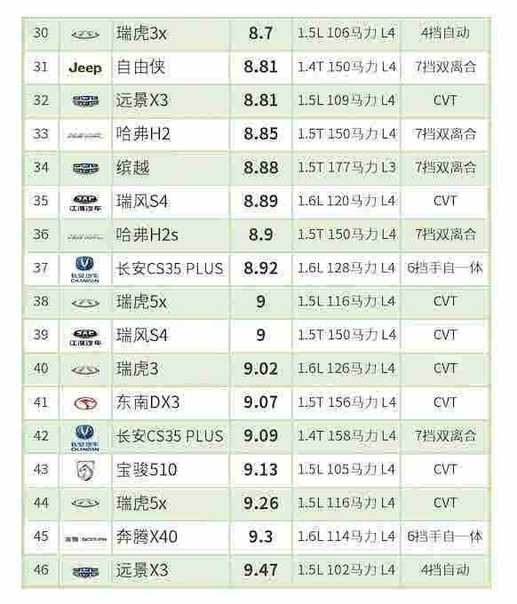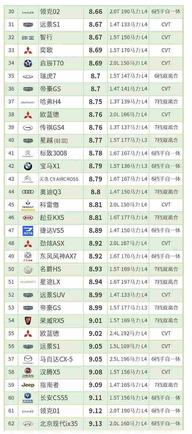 轻混动力、柴油动力车型和汽油车型一起参与排名。
