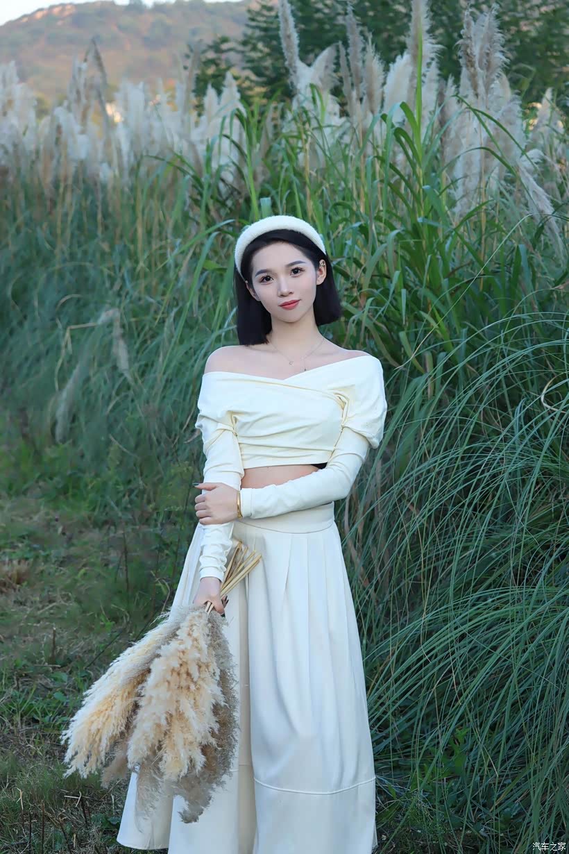 模特的穿搭选择了米白色系的露肩上衣与长裙,这是刻意为之的“减法”。米白与芦苇的浅棕、絮花的乳白、背景草木的深绿形成和谐的莫兰迪色系碰撞,既不抢夺自然的主角光环,又以简洁的色调凸显了“纯净感”,让情绪的表达更显纯粹。