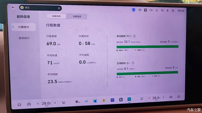 全程大概跑了69公里,设置的是纯电模式,高速行驶下来,电耗显示23.5kWh/100km,大概就是100公里耗23度电左右,我的这款车电池官方参数为44.5kWh,百公里耗电量为22.6kWh,充满电可以跑185KM。