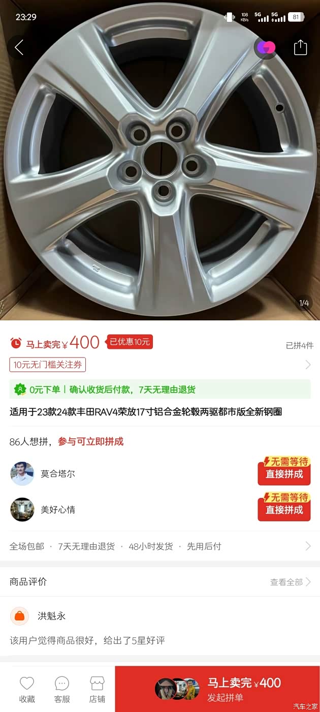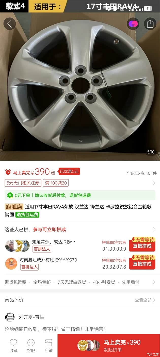 09款RAV4能装15款的17寸轮毂,孔距都是5×114.3,中心孔和ET值也匹配。图1那个390元的银色轮毂造型经典耐看,图2的400元五辐款更运动些。建议选销量高的那款,毕竟6.3万件拼单说明经受过市场检验。记得换轮毂要做动平衡哈