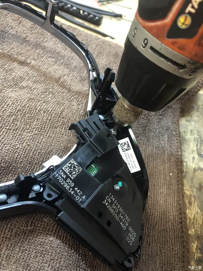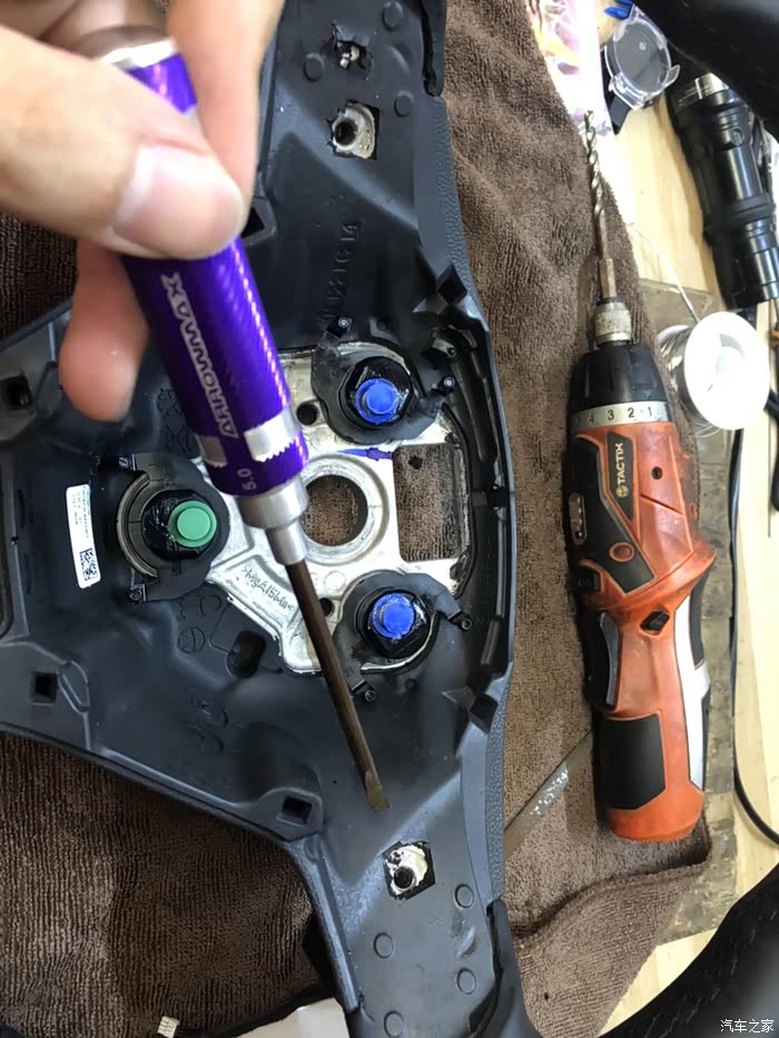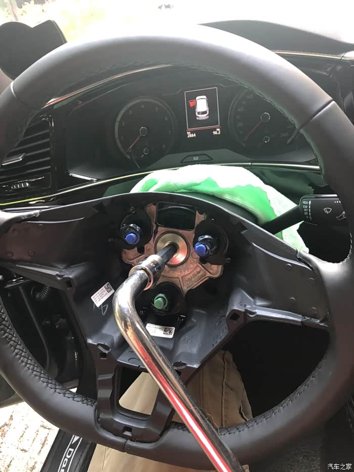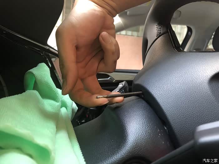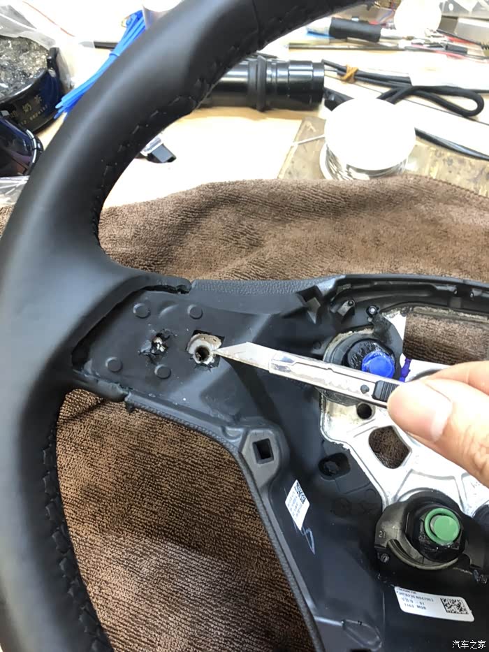 在方向盘3点9点位置的背后插入螺丝刀 用力往上翘,打开方向盘气囊!