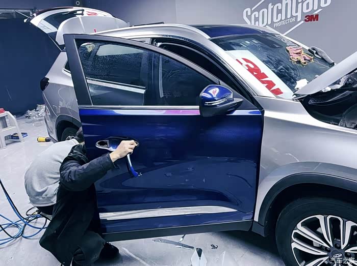 改装过程中,像门把手、四个门板肯定是要拆下来的;全程三个人一起协作,有贴膜的有用刮板塞缝处理细节的,还有用热风枪吹的,进度还是比较顺利的