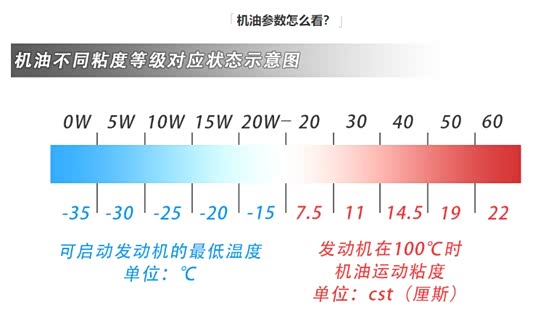 冬夏通用油,牌号分别为:0W-30、5W-30、5W-40、5W-50 “W”表示Winter(冬季),其前面的数字越小说明机油的低温流动性越好,代表可供使用的环境温度越低,在冷启动时对发动机的保护能力越好,W后面的数字代表机油在100℃时的运动粘度,数值越高说明粘度越高。