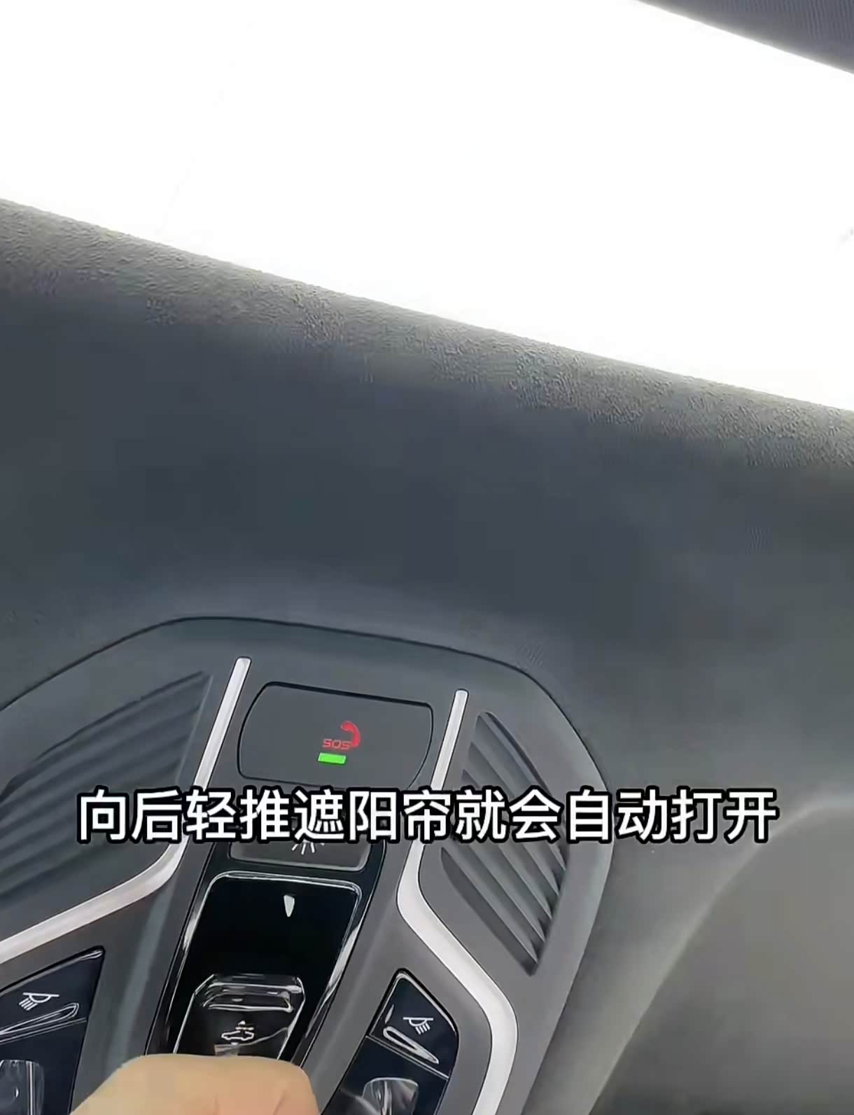 遮阳帘的控制非常简单。只需要用手轻轻向后推开关,遮阳帘就会自动滑动打开,露出车顶的天窗。