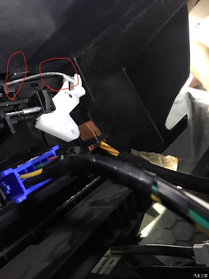 最后一图为新拉线安装完成。圈图处,用一段时间还得变形。出风口方向调节时,是拉和往回挤。拉这没问题,往回挤时弯曲幅度过大,易变形。