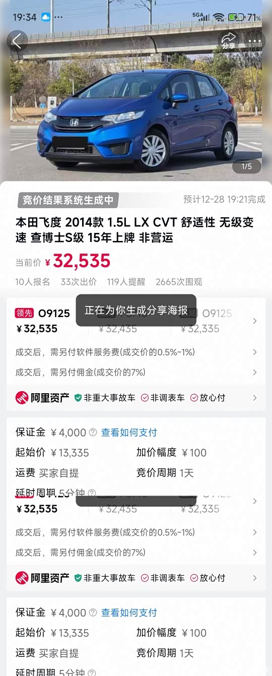 我觉得这是个车子,价格25,000左右是合适的,我出了2万多,我就没有出价了。结果有两个人轮番耗上了。,最终成交价是32535。