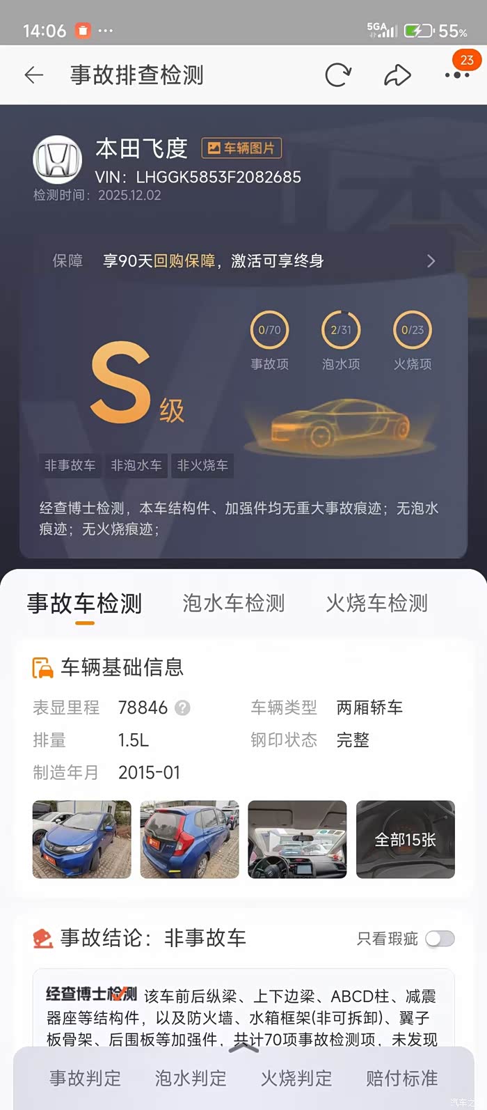 星期天在拍卖网上看到了一辆飞度。,2015年3月份的,里程7.9万。拍卖公司承诺实表,查博士验车也是s级。