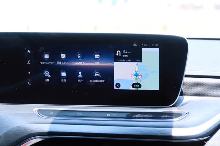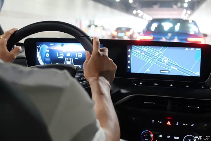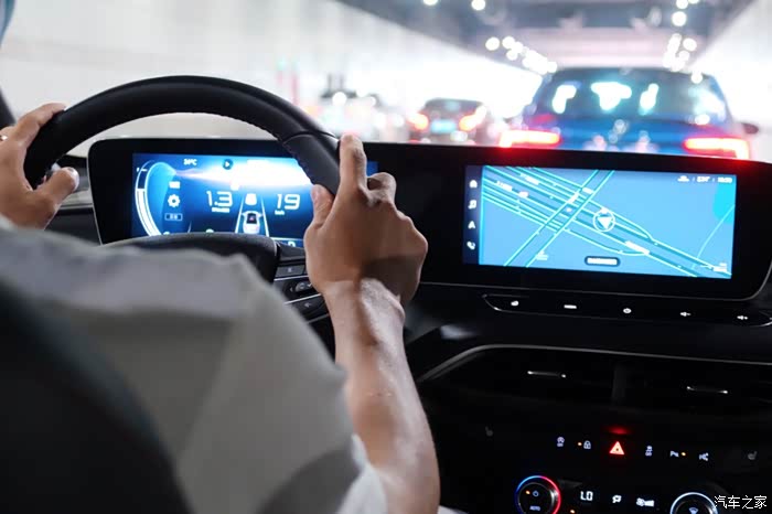 左边仪表盘是车辆周边实时路况显示,右边是全屏的高德地图