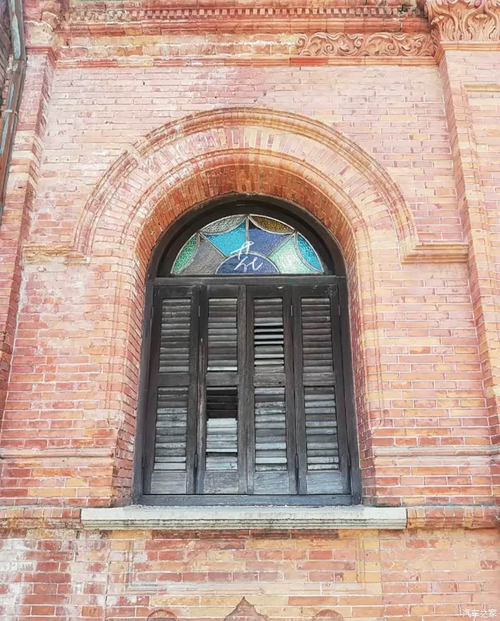 是西式的建筑,红砖外墙,白色雕花廊柱,彩色玻
