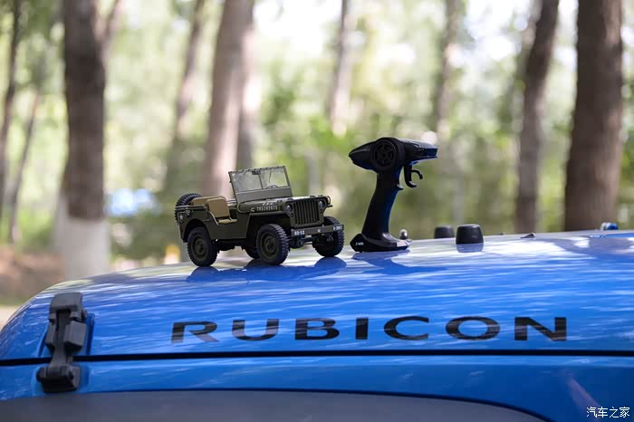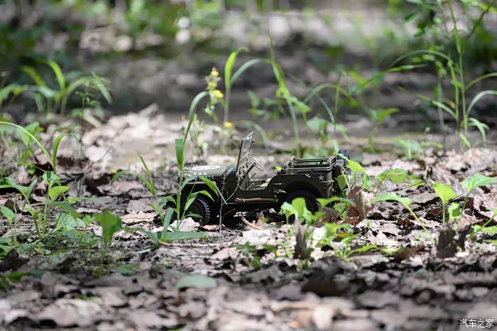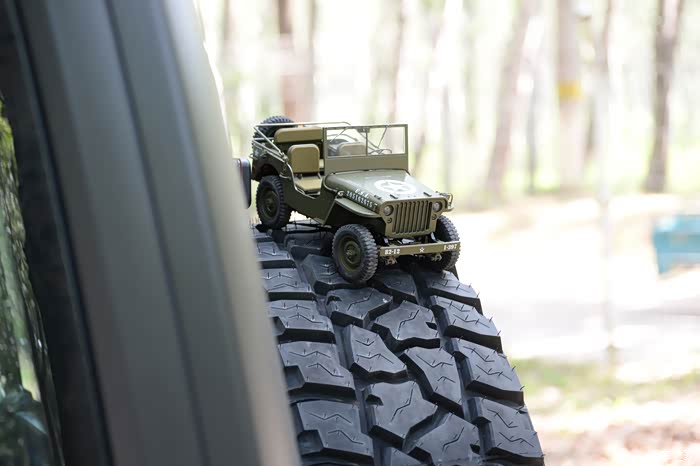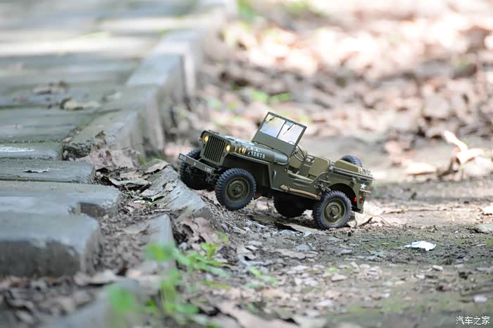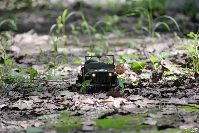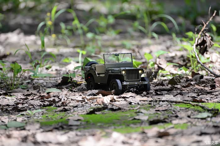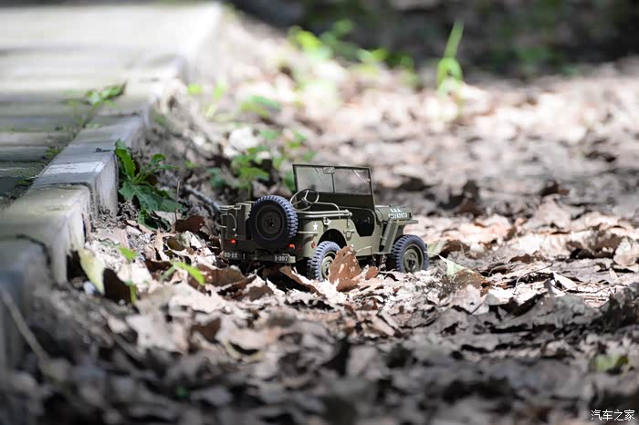 上手体验(本人只玩儿过自己的AXIAL牧马人和田宫大众T1),威利斯基本没有需要设置的。高低速四驱转换键在遥控器方向轮左侧,非常醒目。高速四驱速度能接受,低四更有攀爬的感觉,同时还有新人模式,速度是低四的一半左右。方向盘和转向灯以及车轮可联动,但感觉转弯直径还是有点大。不太适应的是,倒车的操控有点卡顿,而且动力来的有点突然。车辆还原了钢板弹簧的结构,悬挂行程有限,加上突出的前杠,让离地间隙和接近角非常有限,对玩车的场景要求比较高。比如,深草不行,大一点的鹅卵石不行,最适合非铺装硬化土路或沙地。