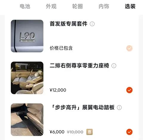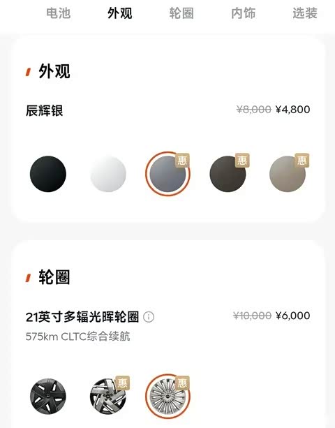 等你看到了顶配,觉得我咬咬牙花30万享受一下人生吧。不,这才刚刚开始呢。打开APP看一眼,五种车身颜色,除了黑白以外剩下的颜色限时优惠价4800元,不算贵,继续咬牙选;20寸轮毂+固特异轮胎虽然尺寸够用,但是样子像个大饼有点丑,如果升级21寸轮毂+米其林轮胎,限时优惠价6000元,还得咬牙上;既然是家用车,那个方便老人孩子上车的电动踏板就算咬碎了牙也得有啊,再来个限时优惠价6000元。一顿折腾下来,再看一眼,现在的整车买断电池价格是多少?31.66万元!