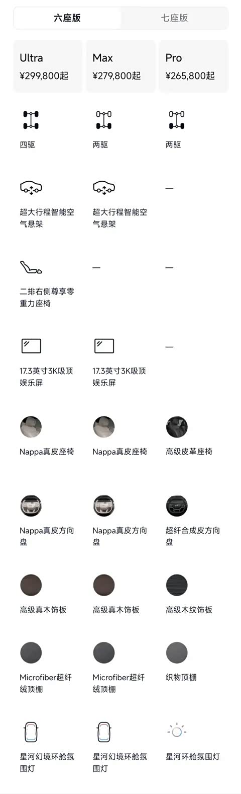 那么Max版和Ultra版差价2万元,除了多一个100kW的前电机外,还给了零重力座椅,这座椅我觉得也是大六座SUV里的必选项。如果买Pro版,不好意思,你连花钱选装的资格都没有。如果选Max版,那么恭喜你,拥有了花钱上零重力座椅的机会,但是,等等,好像又有什么不对劲的地方?聪明的你一定又发现了,其他选装都有6折优惠,怎么就这个座椅一点折扣没有?没错,还是一样的套路,催你上顶配呢。你想,顶配只比中配贵2万,光是零重力座椅就价值1.2万,那8000元让两驱变四驱不是超值吗?