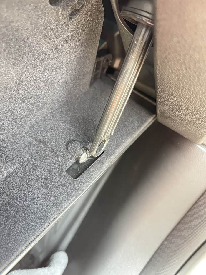 首先我们得将副驾座椅移动到最后方,方便我们操作。然后打开手套箱。手套箱两边各有一个黑色的塑料螺丝卡扣。这边需要用到老虎钳和毛巾,毛巾作用就是防止损伤卡扣(有点紧)。用老虎钳夹住顺时针转动。