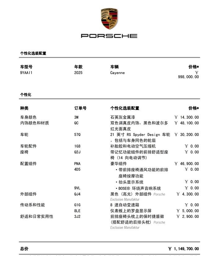 我也是25款,114万配置单,裸车79.5,税7.5,保险1.8,强健包1.8 ,贷70两年利息7万,总的也要97.6。送2次保养,后面自己改装升级还花了6万,总的估计要104.不知道你的贵还是我的贵了。