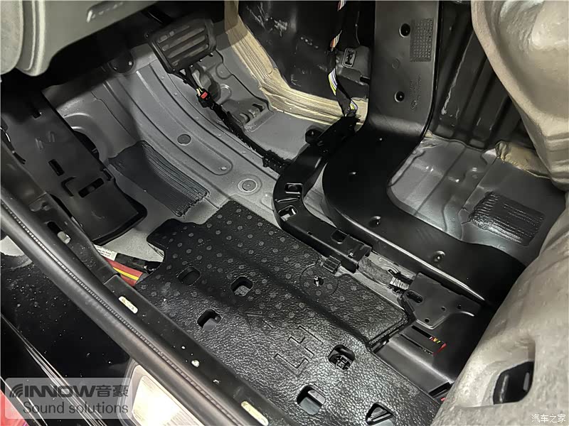 仪表台下方是发动机舱内各类噪声的主要传入路径,技师在使用欧尊止震板对仪表台下方做了止振处理后,又使用黑色线性棉对仪表台下方做了吸音处理,从而减少了发动机舱内各类噪声的传入。