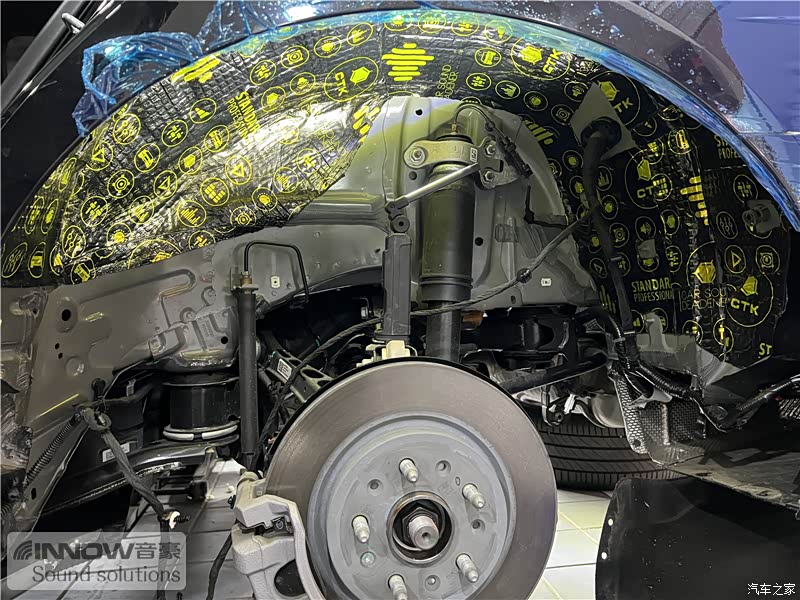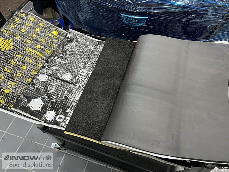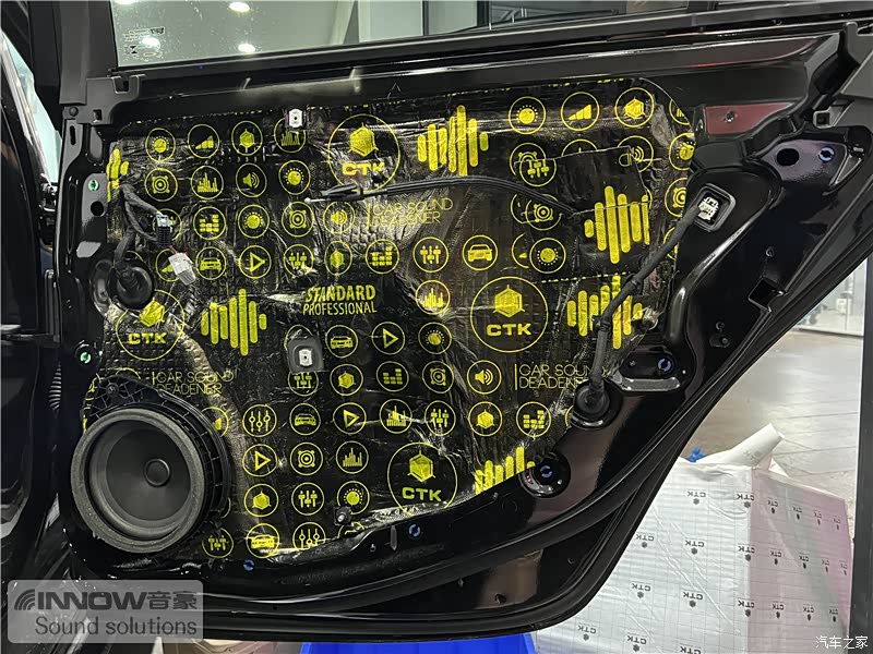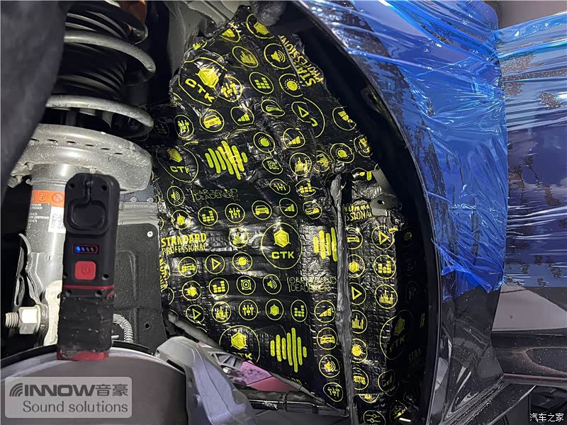 经过检测,技师发现原车的噪声主要有风噪、路噪、胎噪以及来自发动机舱内的噪声几种,因此技师使用欧洲环保隔音CTK,对汽车的门板、四轮翼子板和仪表台下方,做了针对性的隔音处理。