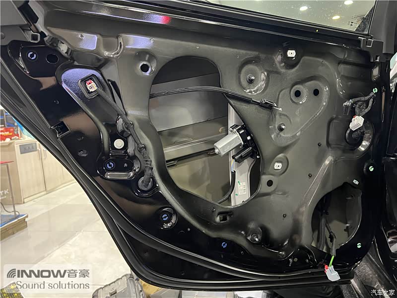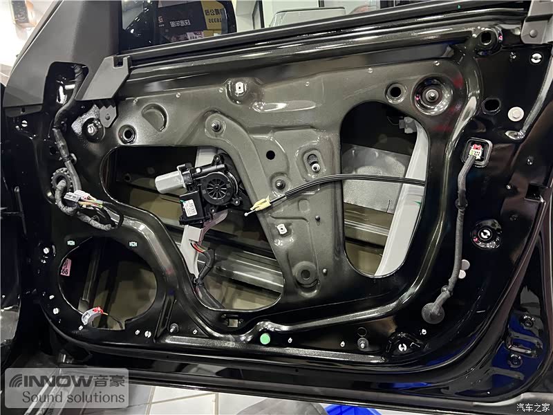 原车门板内部空洞结构较多,且未做有效隔音处理,风噪很容易通过门板传入到车厢内部,技师使用欧标止震板对门板做双层止振处理,欧标止震板使用了更好的物料,铝箔厚度也做到了100微米,可以很好的减少门板自身的振动,并阻止风噪的传入。