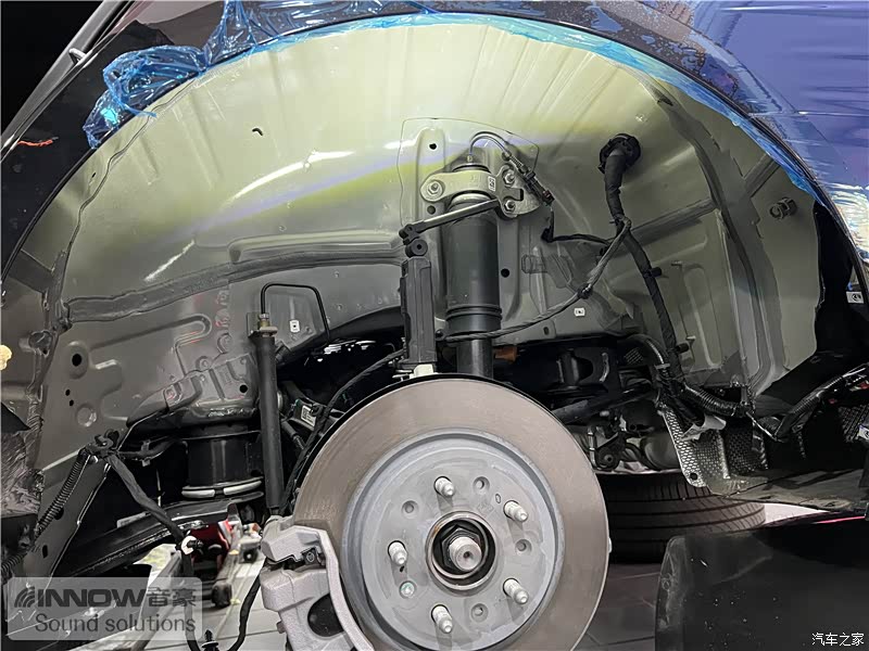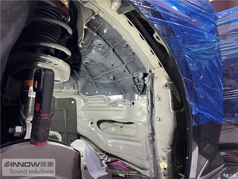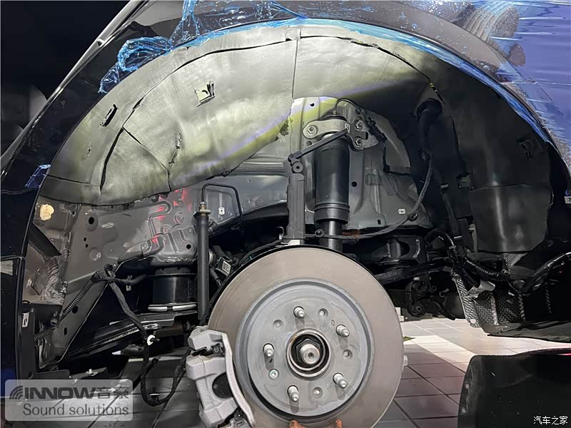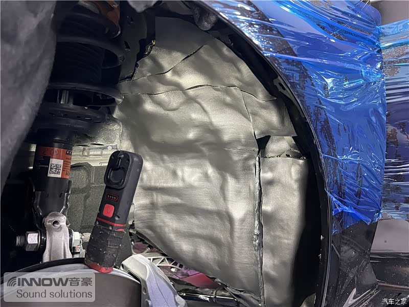 轮胎与地面摩擦会产生路噪和胎噪,这些噪声会通过四轮翼子板传入到车厢内部。技师先使用欧标止震板对四轮翼子板做止振处理,减少钣金振动的产生;再使用弹力棉做吸音处理,将路噪和胎噪进行吸收,双层的施工,阻止了大部分路噪和胎噪的传入。
