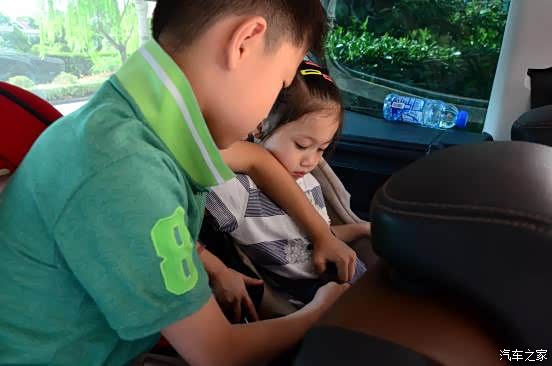 哥哥很贴心的帮妹妹系上儿童安全座椅。