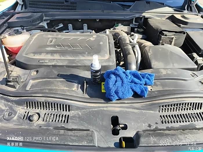 接下来要做的是此次清理较为麻烦的一个环节,也是许多车友最不愿意做的一个项目,工具只需一块擦车巾和发动机舱清洗剂就可以自助完成了。
